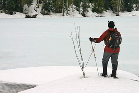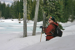 I have opinions about snowmobiles and wilderness that Iâm forced to rethink almost immediately. First of all, though itâs loud and smelly, the snowmobile is really fun. And then thereâs Billâs philosophy about the machines. âThey provide access. Itâs all about appropriate use. We need them for backcountry rescue â they really shorten the amount of time it takes us to return lost hikers home. But also, they provide access to people who wouldnât otherwise get to some of these places. We can bring people up on Mount Adams for the day and shorten the approach to a lot of beautiful places out here.â At our destination, the machine silenced, I find it hard to argue with Billâs logic. Itâs six miles from where weâve parked the car. Goose Lake is frozen and itâs that perfect glacier blue. Bleached tree snags punch through the surface of the ice. Itâs breathtaking. Weâre the only ones out there save a bald eagle whoâs riding a current over the trees. We shuffle our way around the perimeter of the lake. A bald eagle rides a current above the treetops. The Bill Smith experience kicks in. Billâs a storyteller and dozens of people live underneath his Gore-Tex and wool and polypropylene. You might get to hear about how his grandfather came to the US on the back of a giant catfish. You might get to hear about the Bedouin of the Sinai who Bill met while serving there in the US military. You might hear about homesteading in Alaska or the public school kids Bill worked with last week. If youâre lucky, you might get to hear Bill play the banjo and sing.